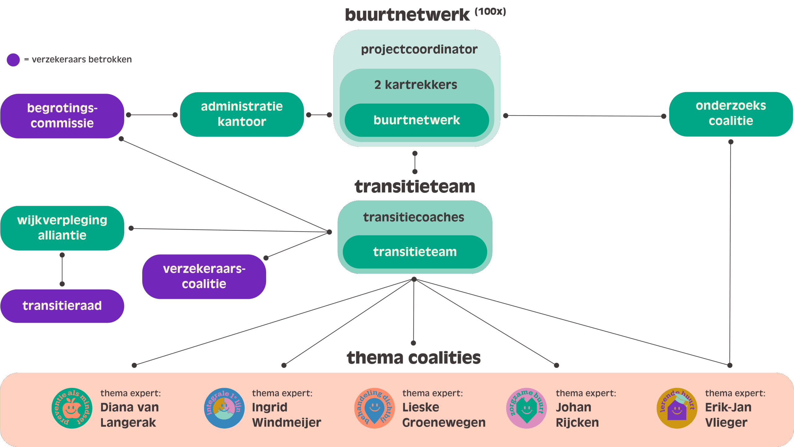Elk succesvol buurtnetwerk begint met de juiste mensen. Een alliantiepartner adopteert het project en stelt een coördinator en kartrekker vanuit de wijkverpleging aan. Samen zetten zij het project op de kaart. Ook wordt een tweede kartrekker aangesteld, bijvoorbeeld vanuit het sociaal domein of de gemeente. Samen werven zij lokale ambassadeurs – professionals en bewoners met een stevig lokaal netwerk . Zij vormen samen het buurtnetwerk.